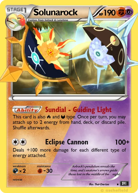 This card is also R and D type. Once per turn, you may attach up to 2 energy from hand, deck, or discard pile. Shuffle afterwards.Eclipse Cannon • 100+