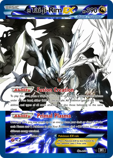 To play this card, place a Tai-Ji-Rim or 1 each of Kyurem, Reshiram, and Zekrom under it from hand, either field, or discard pile. All Pokémon gain all the moves, abilities, and types of all cards attached and also those belonging to the same player.Ability: Primal Plasma
