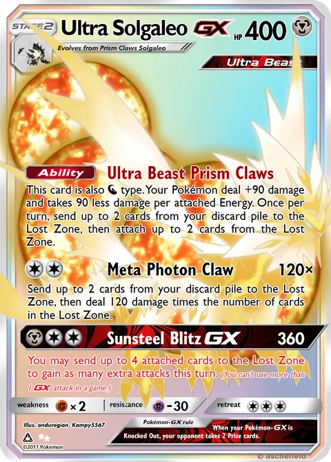 This card is also N type. Your Pokémon deal +90 damage and takes 90 less damage per attached Energy. Once per turn, send up to 2 cards from your discard pile to the Lost Zone, then attach up to 2 cards from the Lost Zone.Meta Photon Claw • 120×