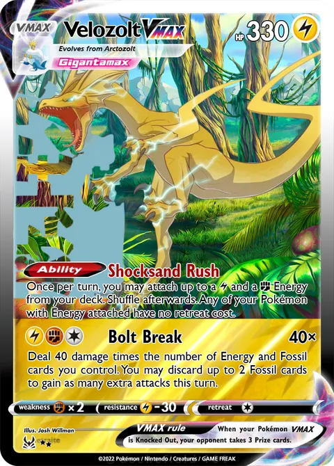 Once per turn, you may attach up to a L and a F Energy from your deck. Shuffle afterwards. Any of your Pokémon with Energy attached have no retreat cost.Bolt Break • 40×