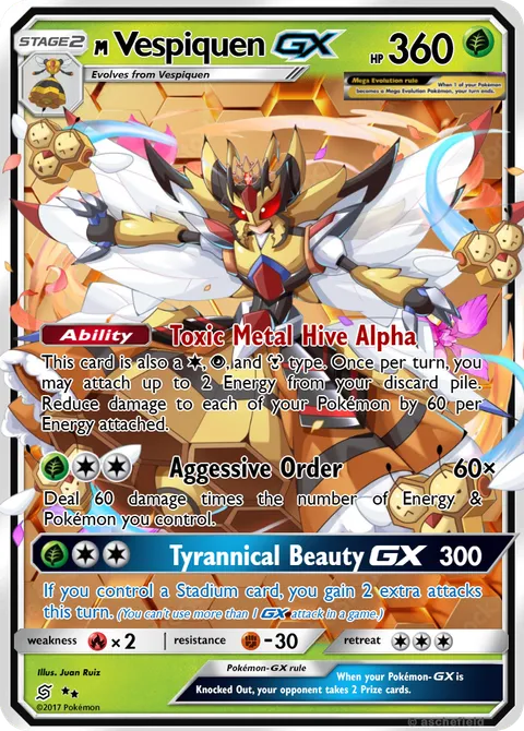 This card is also a C, P, and M type. Once per turn, you may attach up to 2 Energy from your discard pile. Reduce damage to each of your Pokémon by 60 per Energy attached.Aggessive Order • 60×