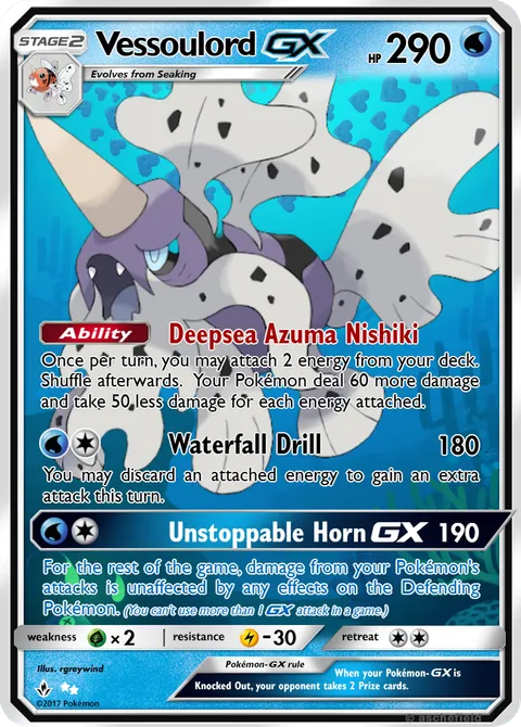 Once per turn, you may attach 2 energy from your deck. Shuffle afterwards. Your Pokémon deal 60 more damage and take 50 less damage for each energy attached.Waterfall Drill • 180