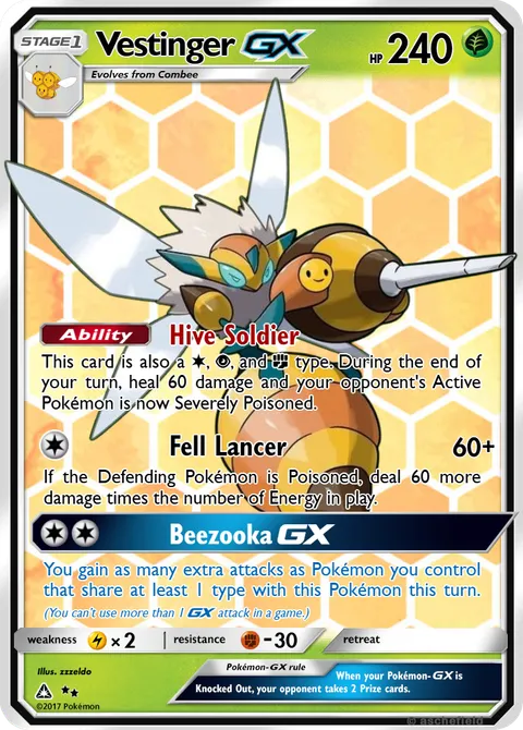 This card is also a C, P, and F type. During the end of your turn, heal 60 damage and your opponent's Active Pokémon is now Severely Poisoned.Fell Lancer • 60+