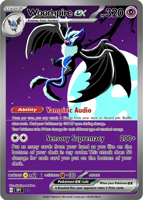 Once per turn, you may attach 3 Energy from your deck or discard pile. Shuffle afterwards. Heal your Pokémon by 100 HP upon dealing damage. Your Pokémon take 60 less damage for each different type of attached energy.Sensory Supremacy • 200+
