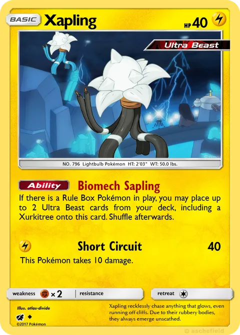 If there is a Rule Box Pokémon in play, you may place up to 2 Ultra Beast cards from your deck, including a Xurkitree onto this card. Shuffle afterwards.Short Circuit • 40