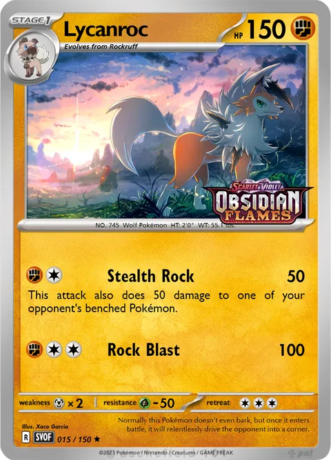 NO. 745 Wolf Pokémon HT: 2'0" WT: 55.1 lbs.illus. Xaco Garcia#015/150Normally this Pokémon doesn’t even bark, but once it enters battle, it will relentlessly drive the opponent into a corner.Created by @ProfessionalCardGenerator on 25 November 2023