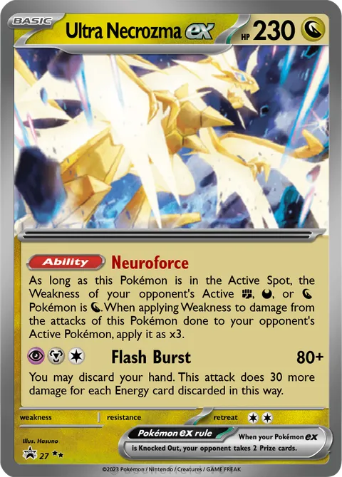 As long as this Pokémon is in the Active Spot, the Weakness of your opponent's Active F, D, or N Pokémon is N. When applying Weakness to damage from the attacks of this Pokémon done to your opponent's Active Pokémon, apply it as x3.Flash Burst • 80+