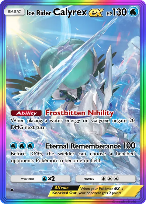 When placing a water energy on Calyrex, negate 20 DMG next turn.