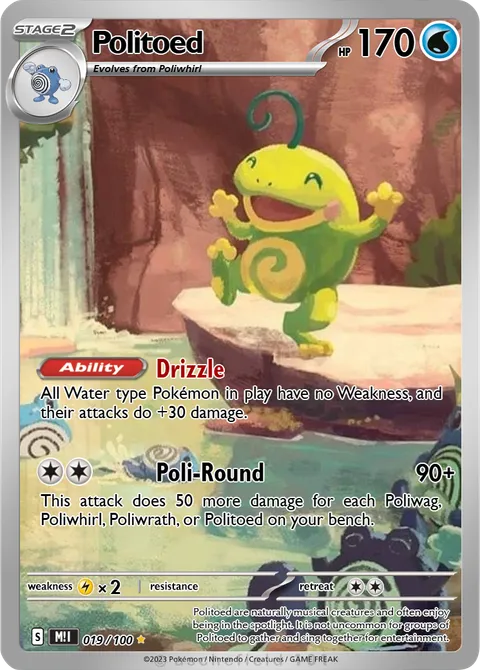 #019/100Politoed are naturally musical creatures and often enjoy being in the spotlight. It is not uncommon for groups of Politoed to gather and sing together for entertainment.Created by @RComicalSeal on 11 August 2025Includes assets by Creatures Inc.