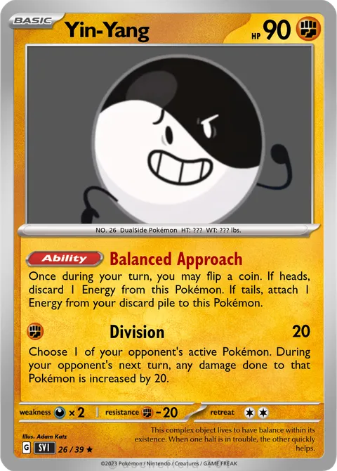 NO. 26 DualSide Pokémon HT: ??? WT: ??? lbs.illus. Adam Katz#26/39This complex object lives to have balance within its existence. When one half is in trouble, the other quickly helps.Created by @Randommakerofcards on 26 June 2025