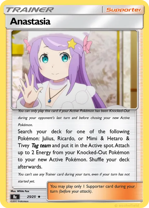 You can only play this card if your Active Pokémon has been Knocked-Out during your opponent's last turn and before chosing your new Active Pokémon. Search your deck for one of the following Pokémon: Julius, Ricardo, or Mimi & Hetaro & Tivey Tag team and put it in the Active spot. Attach up to 2 Energy from your Knocked-Out Pokémon to your new Active Pokémon. Shuffle your deck afterwards. You can't use any Trainer card during your turn, even if your turn has not started yet.