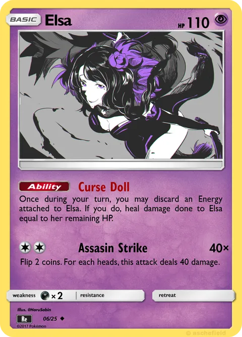 Once during your turn, you may discard an Energy attached to Elsa. If you do, heal damage done to Elsa equal to her remaining HP.Assasin Strike • 40×