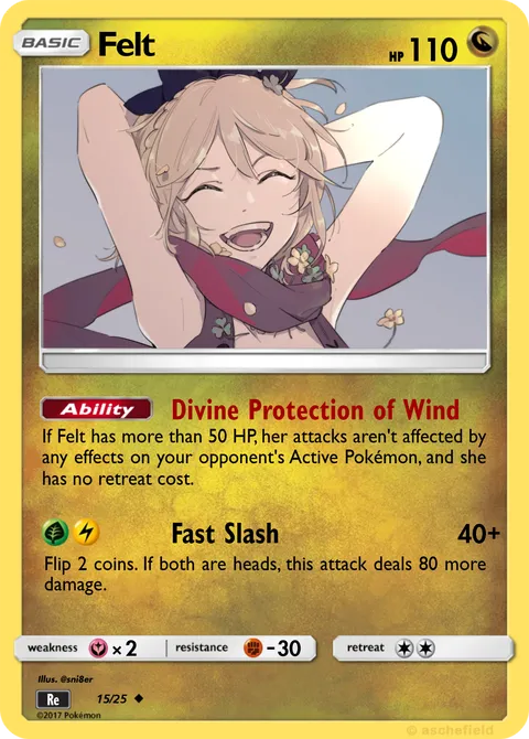 If Felt has more than 50 HP, her attacks aren't affected by any effects on your opponent's Active Pokémon, and she has no retreat cost.Fast Slash • 40+