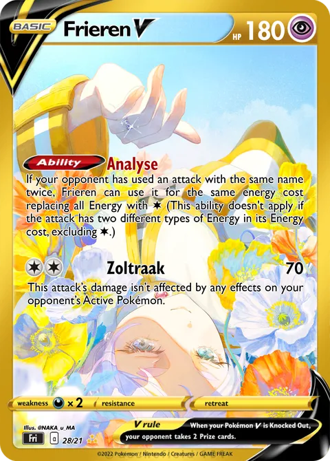 If your opponent has used an attack with the same name twice, Frieren can use it for the same energy cost replacing all Energy with C (This ability doesn't apply if the attack has two different types of Energy in its Energy cost, excluding C.)Zoltraak • 70