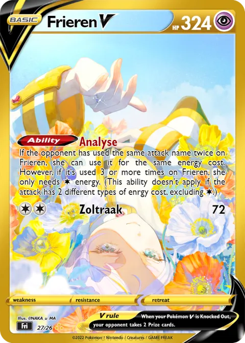If the opponent has used the same attack name twice on Frieren, she can use it for the same energy cost. However, if it's used 3 or more times on Frieren, she only needs C energy. (This ability doesn't apply if the attack has 2 different types of enrgy cost, excluding C.)Zoltraak • 72