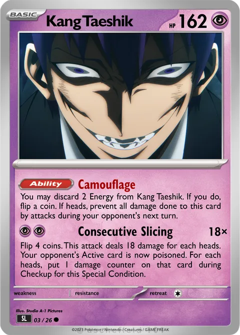 You may discard 2 Energy from Kang Taeshik. If you do, flip a coin. If heads, prevent all damage done to this card by attacks during your opponent's next turn.Consecutive Slicing • 18×