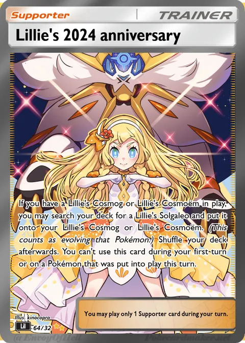 If you have a Lillie's Cosmog or Lillie's Cosmoëm in play, you may search your deck for a Lillie's Solgaleo and put it onto your Lillie's Cosmog or Lillie's Cosmoëm. (This counts as evolving that Pokémon.) Shuffle your deck afterwards. You can't use this card during your first turn or on a Pokémon that was put into play this turn.