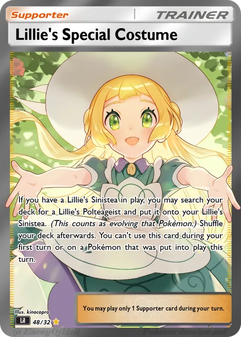 If you have a Lillie's Sinistea in play, you may search your deck for a Lillie's Polteageist and put it onto your Lillie's Sinistea. (This counts as evolving that Pokémon.) Shuffle your deck afterwards. You can't use this card during your first turn or on a Pokémon that was put into play this turn.