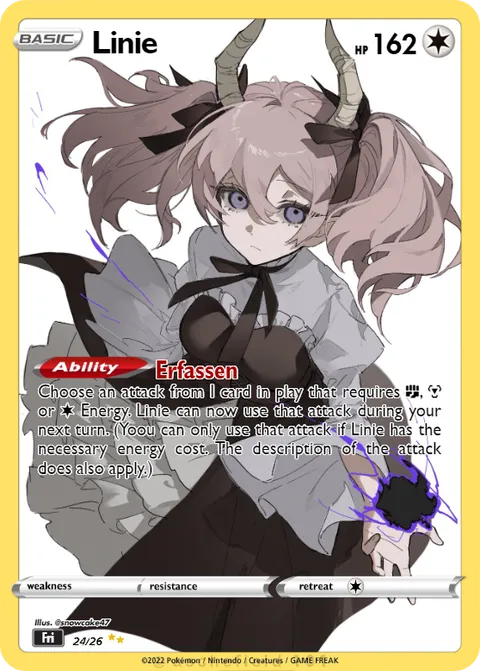 Choose an attack from I card in play that requires F, M or C Energy. Linie can now use that attack during your next turn. (Yoou can only use that attack if Linie has the necessary energy cost. The description of the attack does also apply.)Weakness:None
