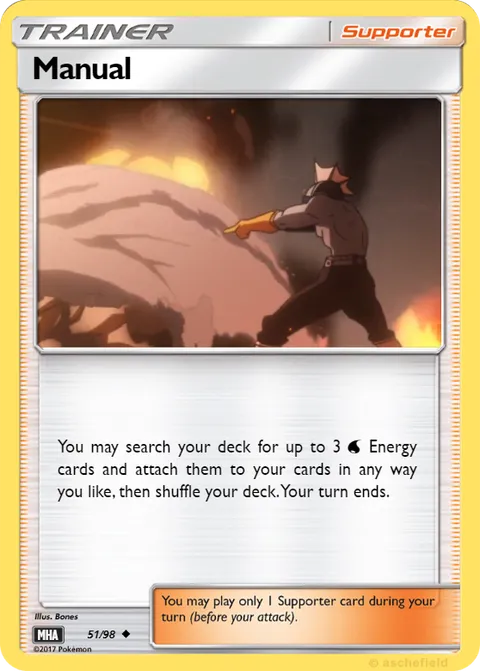 You may search your deck for up to 3 W Energy cards and attach them to your cards in any way you like, then shuffle your deck. Your turn ends.