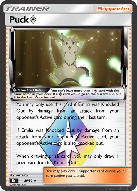 You may only use this card if Emilia was Knocked Out by damage from an attack from your opponent's Active card during their last turn. If Emilia was Knocked Out by damage from an attack from your opponent's Active card, your opponent's Active card is also knocked out. When drawing prize cards, you may only draw 1 prize card for this Knock Out.