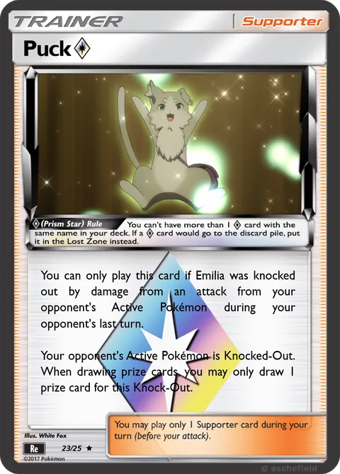 You can only play this card if Emilia was knocked out by damage from an attack from your opponent's Active Pokémon during your opponent's last turn. Your opponent's Active Pokémon is Knocked-Out. When drawing prize cards, you may only draw 1 prize card for this Knock-Out.