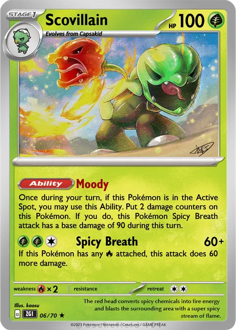 Once during your turn, if this Pokémon is in the Active Spot, you may use this Ability. Put 2 damage counters on this Pokémon. If you do, this Pokémon Spicy Breath attack has a base damage of 90 during this turn.Spicy Breath • 60+
