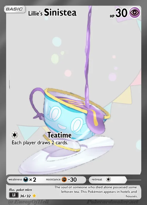 The soul of someone who died alone possesed some leftover tea. This Pokémon appears in hotels and houses.