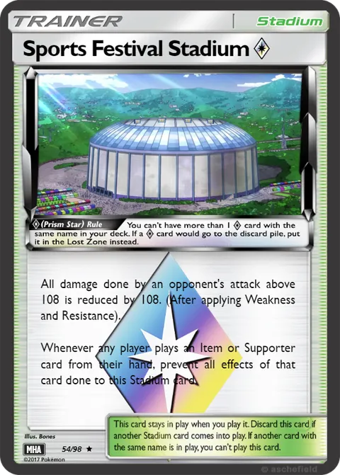 All damage done by an opponent's attack above 108 is reduced by 108. (After applying Weakness and Resistance). Whenever any player plays an Item or Supporter card from their hand, prevent all effects of that card done to this Stadium card.