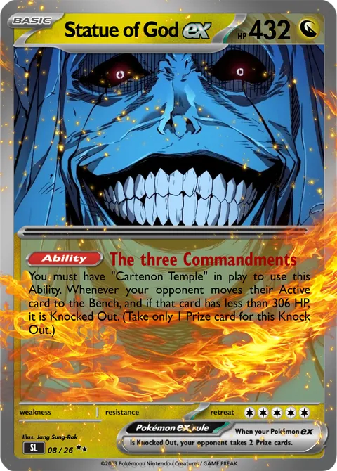 You must have "Cartenon Temple" in play to use this Ability. Whenever your opponent moves their Active card to the Bench, and if that card has less than 306 HP, it is Knocked Out. (Take only 1 Prize card for this Knock Out.)Weakness:None