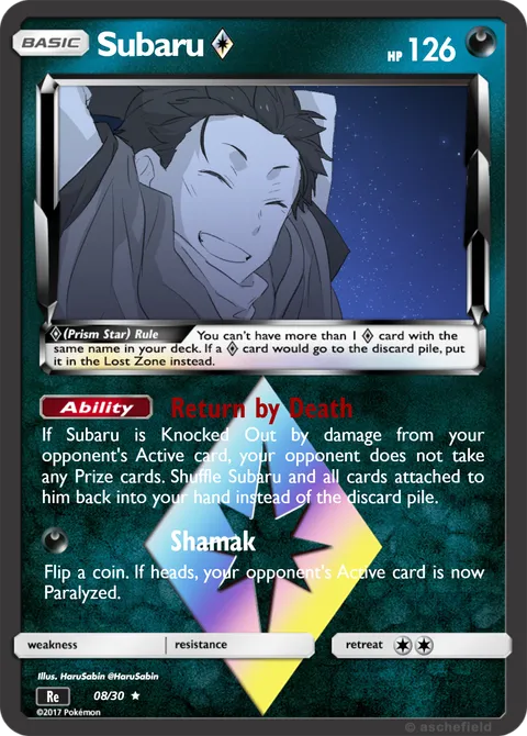 If Subaru is Knocked Out by damage from your opponent's Active card, your opponent does not take any Prize cards. Shuffle Subaru and all cards attached to him back into your hand instead of the discard pile.Shamak