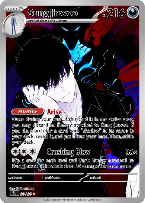 Once during your turn, if this card is in the active spot, you may discard an Energy attached to Sung Jinwoo. If you do, search for a card with "shadow" in its name in your deck, reveal it, and put it into your hand. Then, suffle your deck.Crushing Blow • 36×
