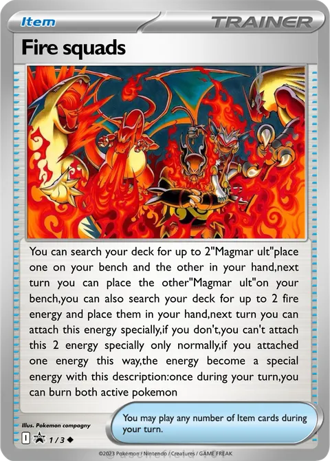You can search your deck for up to 2"Magmar ult"place one on your bench and the other in your hand,next turn you can place the other"Magmar ult"on your bench,you can also search your deck for up to 2 fire energy and place them in your hand,next turn you can attach this energy specially,if you don't,you can't attach this 2 energy specially only normally,if you attached one energy this way,the energy become a special energy with this description:once during your turn,you can burn both active pokemon