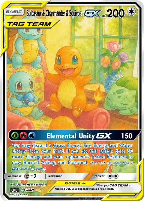 You may discard a Grass Energy, Fire Energy, and Water Energy from your hand. If you do, this attack does 50 more damage and your opponent's Active Pokémon is now Burned, Asleep, and Poisoned.