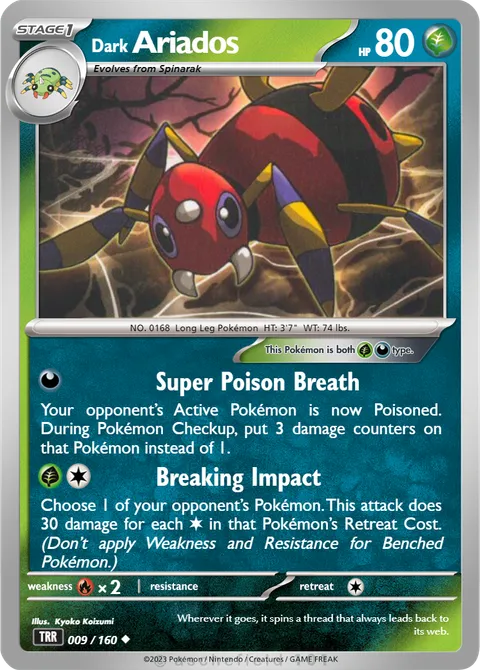 NO. 0168 Long Leg Pokémon HT: 3'7" WT: 74 lbs.illus. Kyoko Koizumi#009/160Wherever it goes, it spins a thread that always leads back to its web.Created by @Rune_Script on 25 December 2024