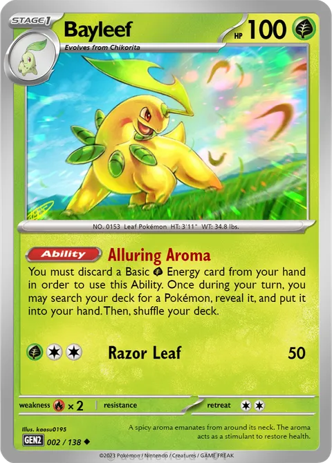 You must discard a Basic G Energy card from your hand in order to use this Ability. Once during your turn, you may search your deck for a Pokémon, reveal it, and put it into your hand. Then, shuffle your deck.Razor Leaf • 50