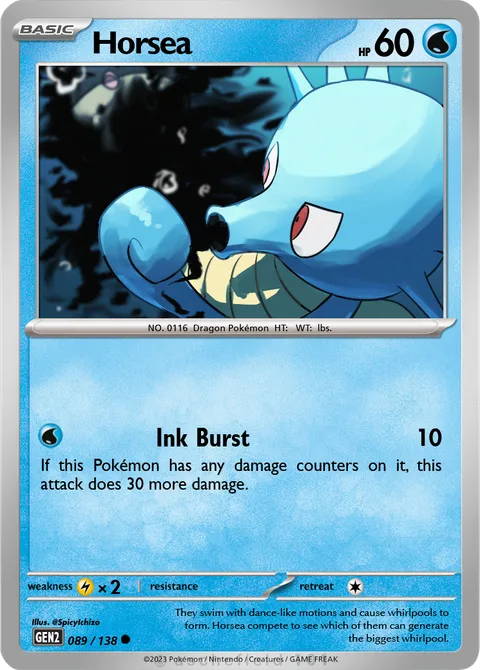 NO. 0116 Dragon Pokémon HT: WT: lbs.illus. @SpicyIchizo#089/138They swim with dance-like motions and cause whirlpools to form. Horsea compete to see which of them can generate the biggest whirlpool.Created by @Rune_Script on 05 May 2025