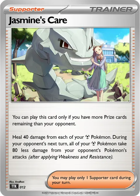 You can play this card only if you have more Prize cards remaining than your opponent. Heal 40 damage from each of your M Pokémon. During your opponent's next turn, all of your M Pokémon take 80 less damage from your opponent's Pokémon's attacks (after applying Weakness and Resistance).