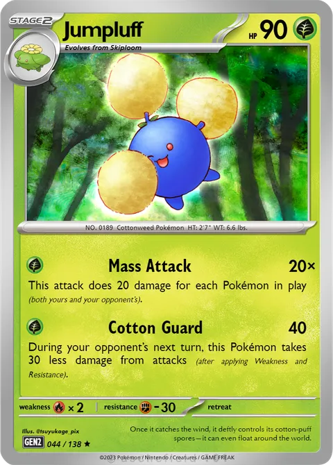 NO. 0189 Cottonweed Pokémon HT: 2'7" WT: 6.6 lbs.illus. @tsuyukage_pix#044/138Once it catches the wind, it deftly controls its cotton-puff spores—it can even float around the world.Created by @Rune_Script on 27 February 2025