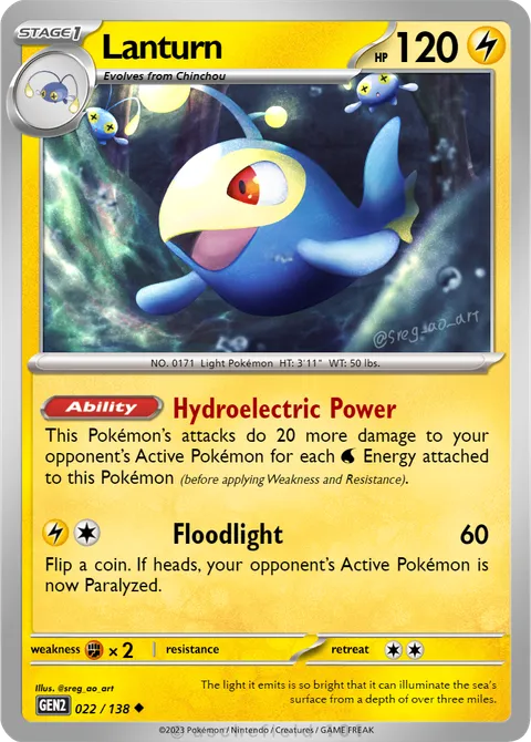 This Pokémon’s attacks do 20 more damage to your opponent’s Active Pokémon for each W Energy attached to this Pokémon (before applying Weakness and Resistance).Floodlight • 60