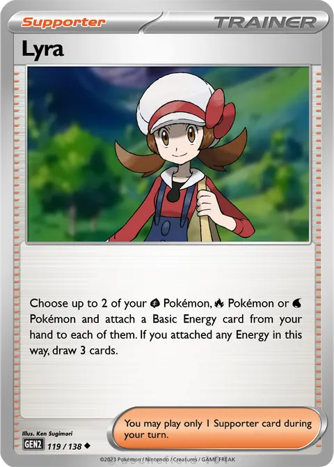 Choose up to 2 of your G Pokémon, R Pokémon or W Pokémon and attach a Basic Energy card from your hand to each of them. If you attached any Energy in this way, draw 3 cards.