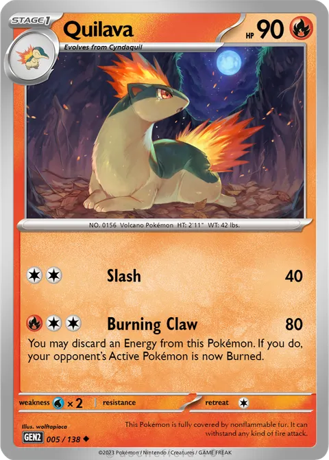 NO. 0156 Volcano Pokémon HT: 2'11" WT: 42 lbs.illus. wolftapioca#005/138This Pokémon is fully covered by nonflammable fur. It can withstand any kind of fire attack.Created by @Rune_Script on 02 November 2024