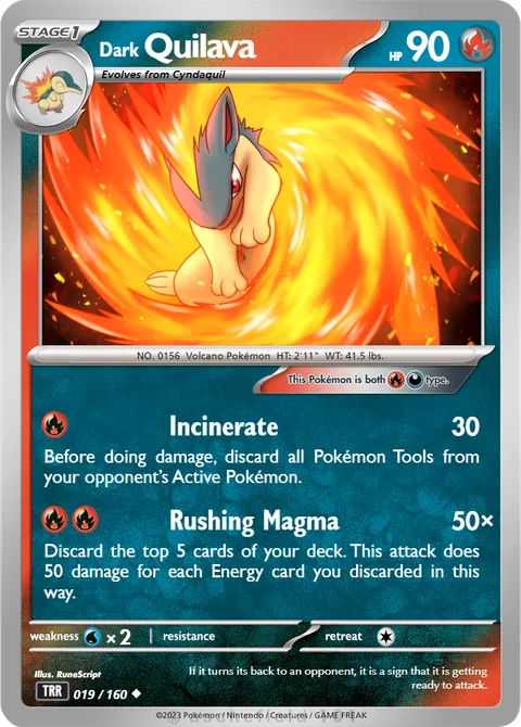 NO. 0156 Volcano Pokémon HT: 2'11" WT: 41.5 lbs.illus. RuneScript#019/160If it turns its back to an opponent, it is a sign that it is getting ready to attack.Created by @Rune_Script on 03 January 2025