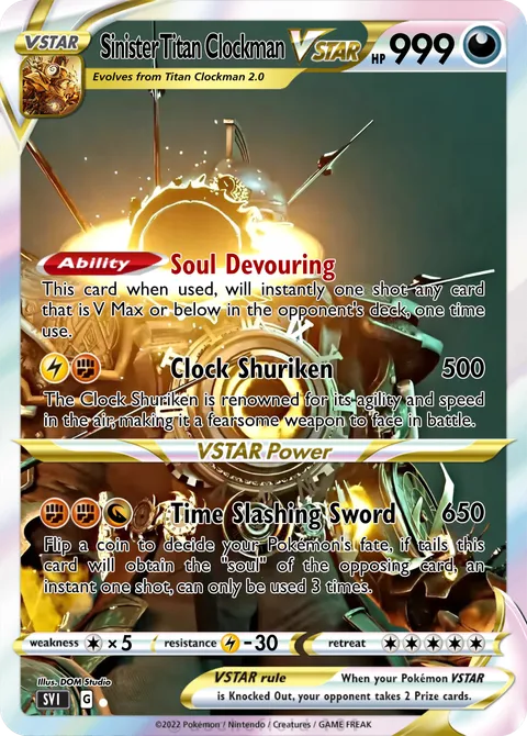 This card when used, will instantly one shot any card that is V Max or below in the opponent's deck, one time use.