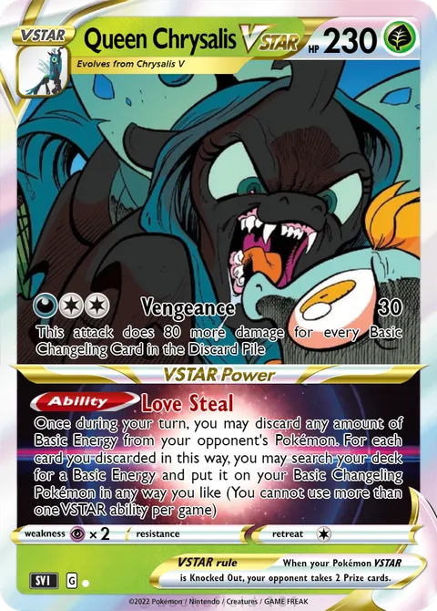 Once during your turn, you may discard any amount of Basic Energy from your opponent's Pokémon. For each card you discarded in this way, you may search your deck for a Basic Energy and put it on your Basic Changeling Pokémon in any way you like (You cannot use more than one VSTAR ability per game)Weakness: