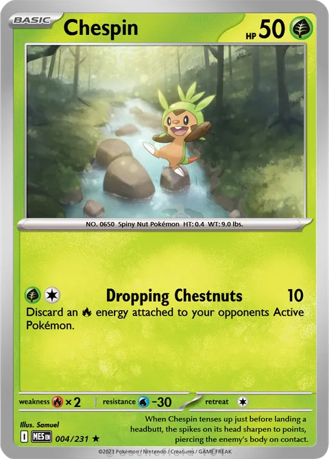 NO. 0650 Spiny Nut Pokémon HT: 0.4 WT: 9.0 lbs.illus. Samuel#004/231When Chespin tenses up just before landing a headbutt, the spikes on its head sharpen to points, piercing the enemy's body on contact.Created by @SamuelG on 14 November 2025