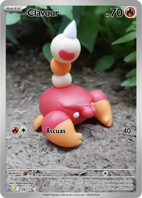 Se oculta bajo la arena, dejando fuera su cola como señuelo. Cuando un Pokémon se acerca, Clavuur la envuelve en llamas. Diseño por @PkScept.