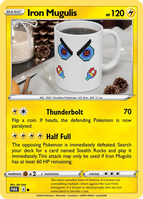 The opposing Pokemon is immediately defeated. Search your deck for a card named Stealth Rocks and play it immediately. This attack may only be used if Iron Mugulis has at least 60 HP remaining.