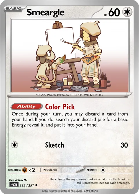 NO. 235 Painter Pokémon HT: 3' 11" WT: 128 lbs lbs.illus. Antony M.#235/251The color of the mysterious fluid secreted from the tip of the tail is predetermined for each Smeargle.Created by @Shideo on 24 June 2025