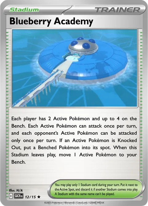 Each player has 2 Active Pokémon and up to 4 on the Bench. Each Active Pokémon can attack once per turn, and each opponent’s Active Pokémon can be attacked only once per turn. If an Active Pokémon is Knocked Out, put a Benched Pokémon into its spot. When this Stadium leaves play, move 1 Active Pokémon to your Bench.